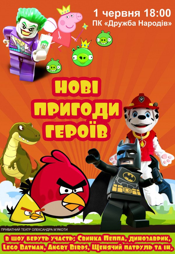 Вистава "Нові пригоди героїв" состоится 1 июня 2017, 18:00, четверг в Дворец культуры "Дружба народов". С помощью сервиса internet-bilet.ua, Вы сможете с легкостью забронировать, заказать и купить билеты на интересующий Вас концерт, спектакль, оперу, балет, мастер-классы, спортивные и детские мероприятия, оплатив их самым удобным для Вас способом: через интернет банковской картой VISA/MasterCard, наличными или курьером, если сделаете заказ билета c доставкой.