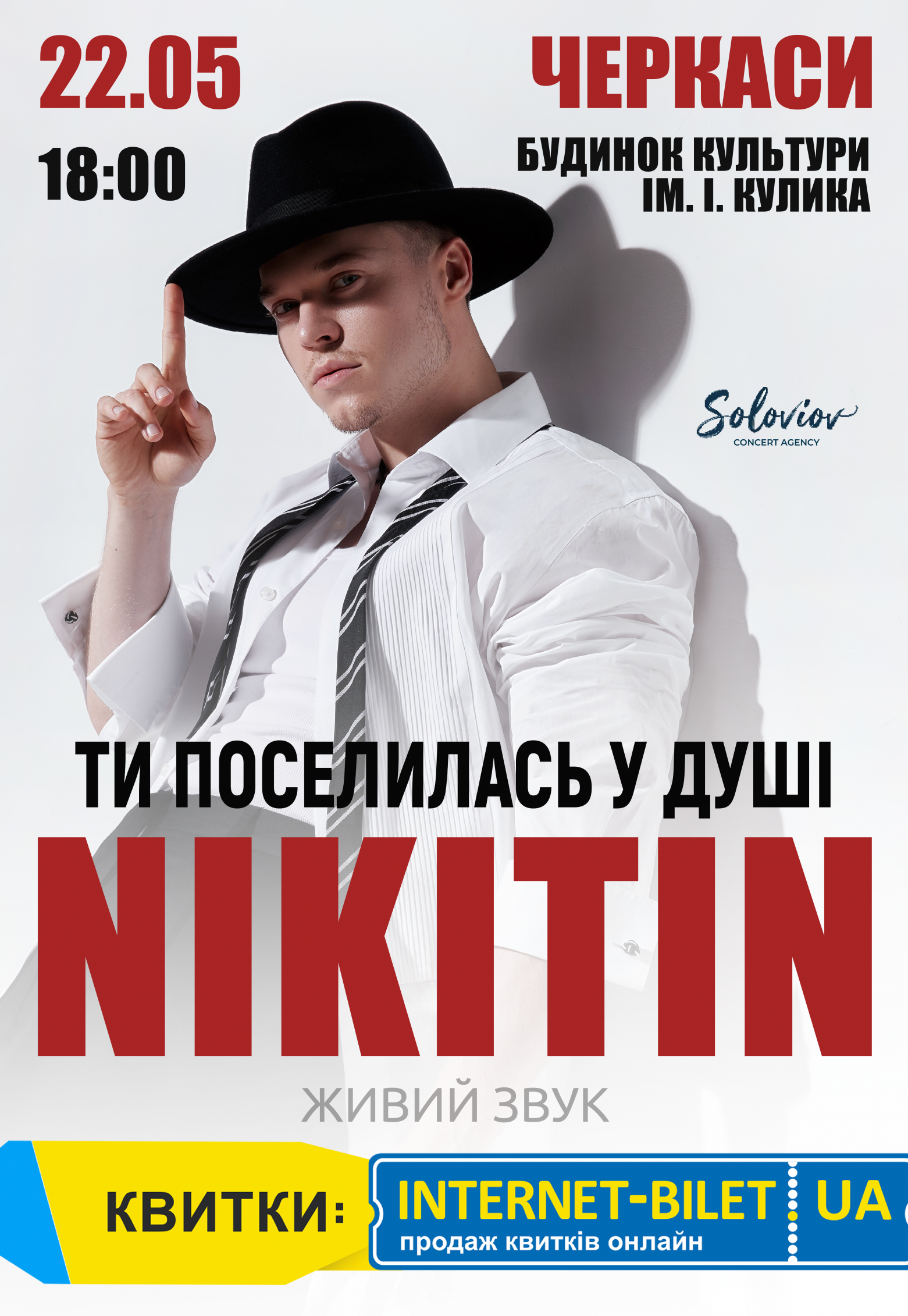 NIKITIN «Ти поселилась у душі» состоится 22 мая 2026, 18:00, пятница в Дом культуры им. Кулика. С помощью сервиса internet-bilet.ua, Вы сможете с легкостью забронировать, заказать и купить билеты на интересующий Вас концерт, спектакль, оперу, балет, мастер-классы, спортивные и детские мероприятия, оплатив их самым удобным для Вас способом: через интернет банковской картой VISA/MasterCard, наличными или курьером, если сделаете заказ билета c доставкой.