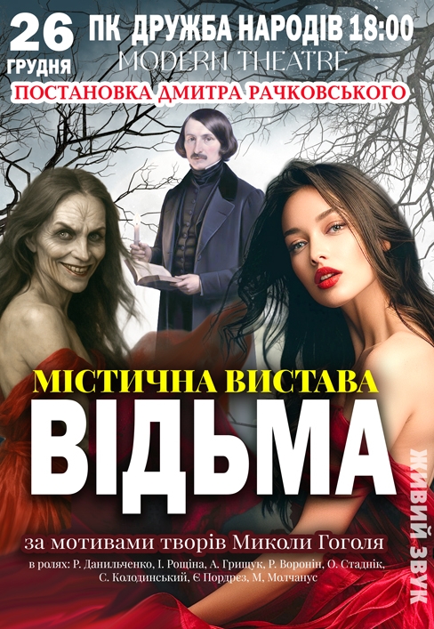 Спектакль "Ведьма" состоится 26 декабря 2025, 18:00, пятница в Дворец культуры "Дружба народов". С помощью сервиса internet-bilet.ua, Вы сможете с легкостью забронировать, заказать и купить билеты на интересующий Вас концерт, спектакль, оперу, балет, мастер-классы, спортивные и детские мероприятия, оплатив их самым удобным для Вас способом: через интернет банковской картой VISA/MasterCard, наличными или курьером, если сделаете заказ билета c доставкой.
