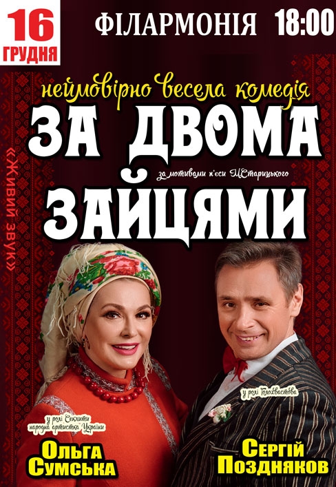Вистава "За двома зайцями" відбудеться 16 грудня 2025, 18:00, вівторок в Черкаська обласна філармонія. За допомогою сервісу internet-bilet.ua, Ви зможете з легкістю забронювати, замовити та купити квитки на концерт, спектакль, оперу, балет, майстер-класи, спортивні та дитячі заходи, що Вас цікавлять, оплативши їх найбільш зручним для Вас способом: через інтернет банківською карткою VISA/MasterCard, готівкою або кур'єром, якщо зробите замовлення квитка з доставкою.